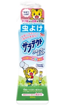 『サラテクトウォーターミスト しまじろう』は、これから暖かくなり、外で遊ぶ機会が増えてくる、お子さまとおうちの方が虫刺されを気にせず、思いっきり外遊びができるように、お肌にやさしいウォーターイン&4種のうるおい成分を配合した虫よけミストです。