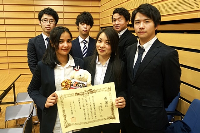 本学は、経営学部 経営学科の一年生と二年生が地域の人と共に行った主に二つの取り組みで表彰をされました。一つは渋谷駅周辺の陸橋や壁に貼られたシール、スプレーで描かれた落書きを消す活動。もう一つはハロウィン付近の3日間、センター街を中心に渋谷のまちで行った400名体制のゴミ拾いです。「思った以上に大変な作業だったけど楽しい。来年もまた参加したい。」と、地域に対する学生の美化意識は高まっています。