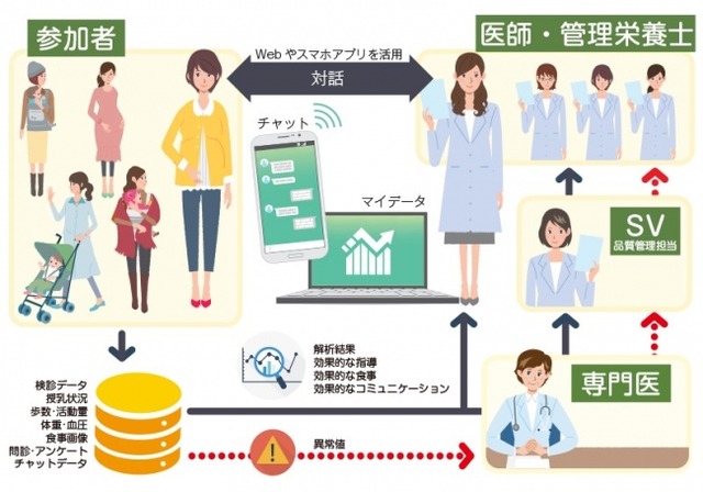 こういった背景のもと、妊娠中から子育て期の女性の疾病予防や健康増進を実現するために、IoT対応の検査機器などにより取得される健康情報と妊娠子育て期の女性特有の健康情報(授乳状況など)を組み合わせて、対象者本人と医療従事者が対象者の健康状態をアプリやPCを通じて簡易的に把握し、「適切な知識の提供だけでなく、食事・身体活動・授乳推進をサポートし伴走」することで、前向きな行動変容が起き、自発的な健康づくりが成立していくかを検証します。