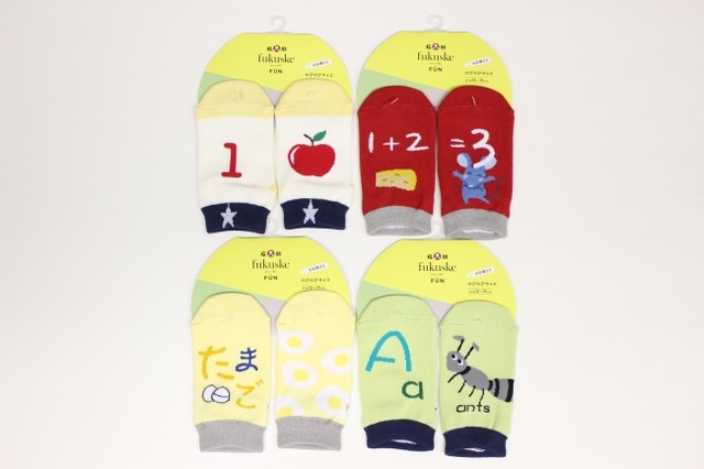 商品の特長としては、ソックスの左右で違う柄が描かれており、それぞれの柄の関係性を考えながらペアにしていくというものです。例えば、左足が“かえる” 右足が“おたまじゃくし”などになっていて、動物の親子を左右ペアにして組み合わせます。ベビーとキッズで2シリーズごとの展開を行い、ベビーソックスでは<かたちシリーズ>と<くみあわせシリーズ>、キッズソックスでは<かずシリーズ>と<ことばシリーズ>の計4シリーズがございます。