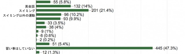 アンケートによると、回答者のうちのほぼ半数にあたる48.4%が「習い事をしている」と回答。そのうちの約44.2%にあたる201名が「スイミング」を習わせ、次いで29%が「英会話」と回答しました。