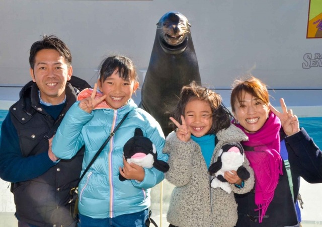 本コンテストは、今年で17回目を迎える新春恒例イベントで、「笑う門には福来たる」 ということわざにあやかり、新年からたくさんの福を呼び込めるようにと願いを込めて開催されました。参加者は、アシカパフォーマンス終了後に、笑うアシカと一緒にとびっきりの笑顔で撮影を行い、今年は153件の応募がありました。