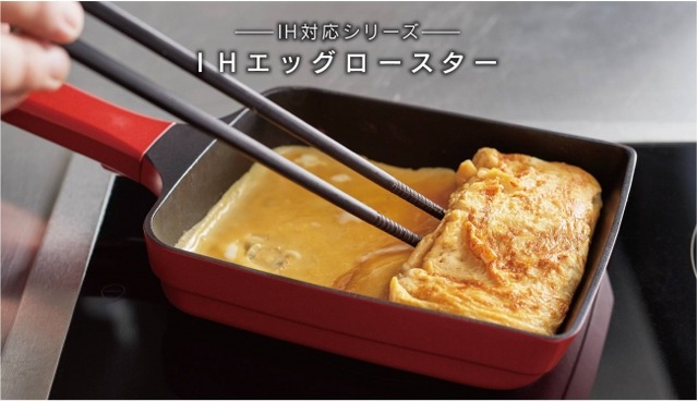 春はお弁当作りや一人暮らしを始める方も多い季節。そんな方々のために朝の定番、卵焼きを上手に作ることができる「エッグロースター」を新発売いたします。優れた耐久性と華やかなカラーが人気の「IHルビー・エクセレンス」シリーズに新しく加わった「エッグロースター」。耐久性に優れたキャスト製(鋳造)の厚い底面は、蓄熱力が高いためじっくりやわらかく熱が伝わり食材をムラなく加熱して、きれいな黄金の焼き色とふんわりとした食感の卵焼きが出来あがります。また、本体はアルミ合金で軽量なため、卵焼きを返しやすく使いやすいと好評です。両面ふっ素樹脂コーティングでお手入れも簡単。“取っ手つき”タイプと“取っ手のとれる”タイプからお選びいただくことができます。