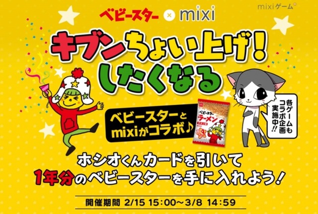 株式会社おやつカンパニー(本社所在地:三重県津市 代表取締役社長:手島文雄)は、株式会社ミクシィ(本社所在地:東京都渋谷区 代表取締役社長:森田仁基)のVantageスタジオ(ヴァンテージスタジオ)が運営するSNS『mixi』(以下mixi)及びmixiゲームにおいて、『ベビースターラーメン』とのコラボキャンペーンを2018年2月15日より実施します。