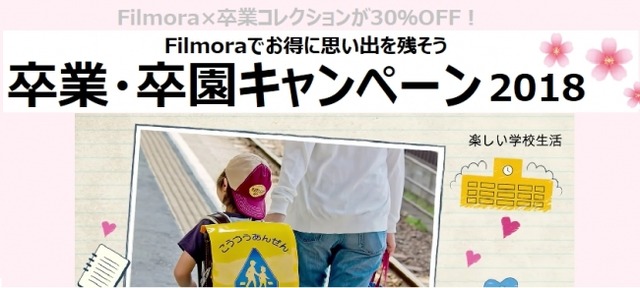 今年もやってきました、桜舞う卒業の季節。一生に一度の素敵な思い出をFilmoraの”卒業コレクション”で演出してみませんか?卒業コレクションの発売を記念し、Filmoraと卒業コレクションが期間限定お得なセット価格で販売いたします。永久保存版の動画・写真をSNSでシェアすると素敵なプレゼントが当たる「#Fimora卒業」キャンペーンも実施。詳しくはFilmoraウェブサイトをご確認ください。