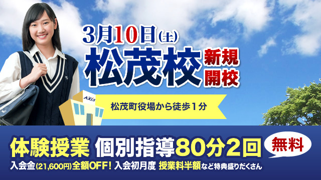 開校を記念し、特典をご用意しました。見学・学習相談は、いつでも承っておりますので、ぜひこの機会に「個別指導Axis松茂校」をご利用ください。
