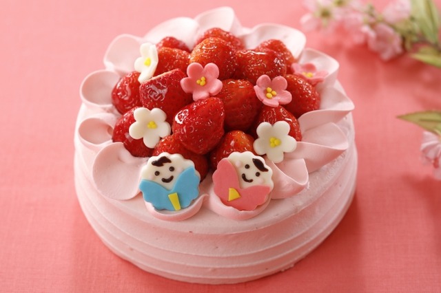 お内裏様とお雛様をあしらい、桃の節句を祝うようにたっぷりといちごとクリームで花形に見立てたデコレーションが華やか。春気分に満ちたケーキでお嬢さまの成長をおいしく楽しくお祝いください。