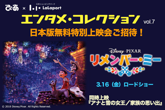 あらゆる世代に良質なエンタテインメントの情報やチケットをお届けするぴあ株式会社と、ショッピングをはじめ、あらゆる世代が楽しく集える「場」を提供し続ける商業施設・三井ショッピングパーク ららぽーと(三井不動産商業マネジメント株式会社)がコラボレーションした「ぴあ×ららぽーと“エンタメ・コレクション”」の第7弾として、ららぽーとTOKYO-BAY、横浜、富士見、磐田、EXPOCITY、柏の葉にある映画館で『リメンバー・ミー』の日本版無料特別上映会を実施することが決定いたしました。実施は公開初日となる3月16日(金)、人気キャラクターたちが再結集する『アナと雪の女王/家族の思い出』(22分)も同時上映される。