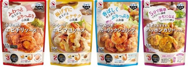 「ネギと卵のエビチリソース」、「やみつきガーリックシュリンプソース」に付属した「エビぷり粉」は、焼く前にエビにまぶすことで、エビを焼く際の水分消失を抑え旨味を閉じ込めて焼き縮みを防ぎ、エビ本来のぷりっとした食感をお楽しみいただけます。また、「とろ~りエビマヨソース」に付属した「サクぷり粉」は、エビぷり粉同様、エビをぷりっとした食感に仕上げるだけでなく、「揚げ物は食卓にボリュームが出て、美味しいから好き」だが「片付けが面倒」「油はねが危険」といった主婦の揚げ物に対する悩みを解決し、フライパンで焼くだけで簡単にサクッとした軽い食感のフリッターに仕上げます。