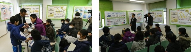 当日は福井県小浜市環境衛生課にもご協力をいただきながら、エコスタイル仏谷太陽光発電所内の管理棟で環境教育を実施いたしました。雪の影響のため発電所見学は中止となりましたが、管理棟内壁面の環境教育パネルを用いて地球温暖化の影響や太陽光発電の仕組み、仏谷発電所の減災への役割についてエコスタイル社員が子供たちへ授業を行いました。子供たちは積極的に授業へ取り組み、地球温暖化対策について「まずは自分たちに出来る事を1つでも多く進めていきたい」といった声も多く聞くことができました。