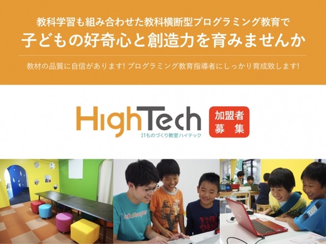 HighTech(ハイテック)は、当社が開発をするプログラミング教育教材、カリキュラムを提供するプログラミング教室のフランチャイズです。HighTechを通じて、子どもの好奇心という学習意欲の芽を育む教育を全国に広げてまいります。
