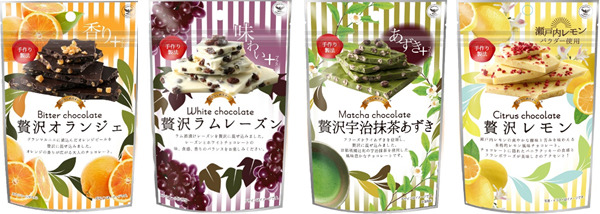 人気NO.1の「ビターチョコレート贅沢オランジェ」をはじめ、「ホワイトチョコレート贅沢ラムレーズン」「抹茶チョコレート贅沢宇治抹茶あずき」が生まれ変わると同時に、初のシーズンアイテム、「シトラスチョコレート贅沢レモン」が加わって、4品新登場。