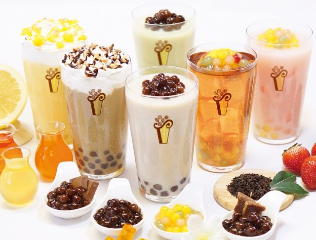 タピオカドリンクは定番のミルクティーからフルーツたっぷりのティーやカルピス、フローズンなど約50種類。