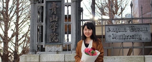 青学の校門前で記念撮影、春から憧れのキャンパスライフが待っています