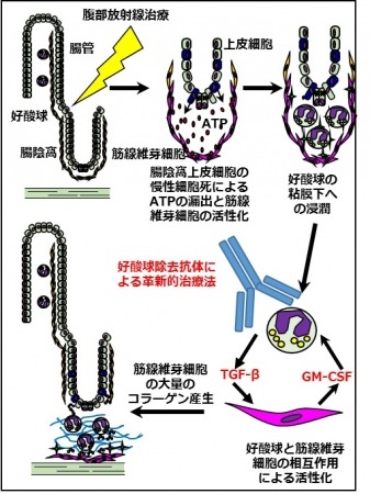 放射線誘発性腸線維症(注2)は、骨盤内腫瘍または腹膜転移のための腹部放射線療法後の重篤な合併症で、特に小腸の粘膜下組織に顕著な線維化を引き起こします。この病態には、粘膜下組織での活性化好酸球の過剰浸潤が関連していました。腹部放射線照射後、腸管陰窩では慢性の細胞死が誘導された結果、細胞外にアデノシン三リン酸(ATP)(注3)の漏出を引き起こし、陰窩直下の筋線維芽細胞を活性化させました。この活性化筋線維芽細胞は、粘膜下に好酸球を浸潤させるとともに、活性化させることが分かりました。粘膜下の活性化した好酸球は、TGF-βの産生を介して、逆に筋線維芽細胞からのコラーゲン産生を促し、粘膜下に著明な線維化を誘導することが明らかになりました。