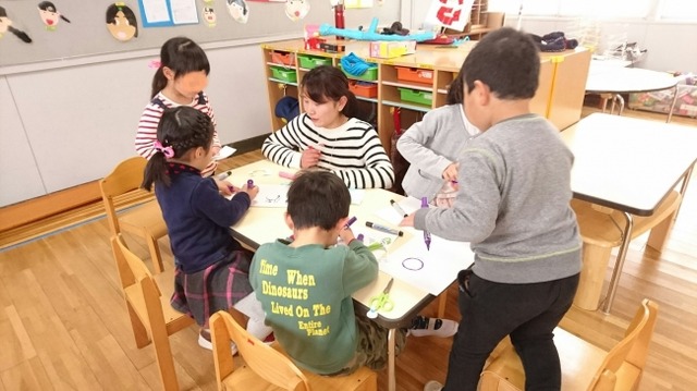その後、身近に再利用して遊べるものとして牛乳パックを利用したバッジづくりを体験しました。