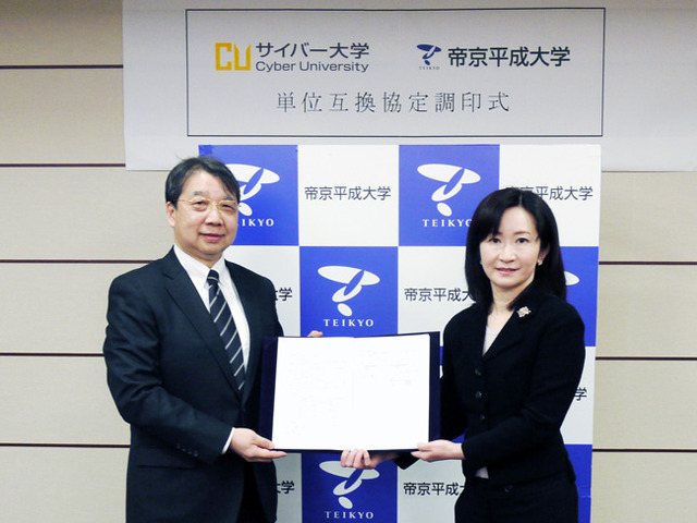 帝京平成大学(学長:冲永 寛子、所在地:東京都豊島区)と、サイバー大学(学長:川原 洋、所在地:福岡市東区)は、このたび単位互換協定を締結しました。帝京平成大学の学生は2018年度秋学期(10月)より、サイバー大学が提供するeラーニング科目(教養科目とIT・ビジネス系専門基礎科目からなる60科目以上)の中から希望する科目を履修し、修得した単位を卒業要件に算入できます。サイバー大学の授業は「いつでも」「どこでも」受けられることを特長としているため、現行のカリキュラムの授業時間などに影響されることなく、学修機会を大幅に増やすことができます。