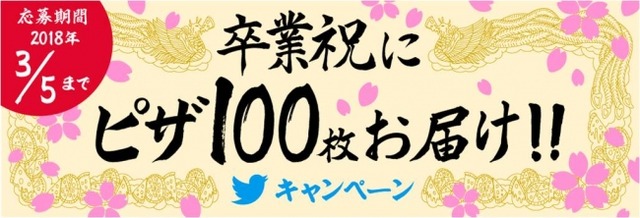 本日より3月5日まで開催します「卒業祝にピザ100枚お届け!Twitterキャンペーン」についても、人生の新たな1ページをスタートする卒業パーティーという記念日を、「Pizza(ハート)」が生み出す「おいしいピザ顔」で彩り、愛にあふれた、楽しい思い出にしていただきたいという想いから生まれました。本キャンペーンは、3月17日(土)、18日(日)に卒業パーティーを予定されている方であればどなたでも、Twitterを通じて応募していただくことが可能です。当選した3組の卒業パーティーグループには、ピザハットより100枚のピザをお届けします。(キャンペーンの詳細については、本リリース内のキャンペーン概要ならびにキャンペーン特設サイトをご確認ください)