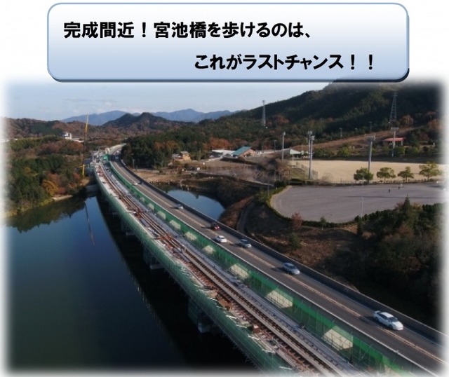 見どころ: PC桁を現場で製作するといった珍しい工法で造られた宮池橋。舗装される前の、出来たてホヤホヤの宮池橋の上を歩いてみませんか。なお、当日は、いろいろなサプライズ企画を準備してお待ちしています。