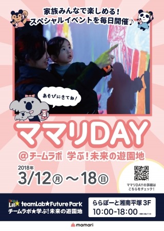 2017年に「チームラボ 学ぶ!未来の遊園地 ららぽーと富士見店」にて3日間開催した第1回目の「ママリDAY」は、約400名の親子がステッカーラリーに参加するなど好評をいただき、このたび会期を7日間に延長した第2弾の開催が決定いたしました。