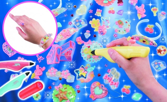 新発売の「クリスタルアクセサリーセット」には、新色のクリアインクペンとパールピンク・ラメイエローペン、デコレーション用のブレスレット・リングパーツなどが入っており、クリスタルのような透明感の美しいレジン風アクセサリーを簡単に作ることができます。付属の3Dプリントパーツを使えばぷっくりとかわいい立体的なアクセサリーやデコレーションパーツが作れ、さらにクリアインクと組み合わせて使う「デコフィルム」や女の子の大好きなラインストーンもセットになっているので、アレンジの仕方は無限大!自分だけのオリジナルアクセサリー作りをたっぷりと楽しむことができます。