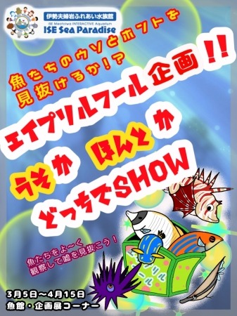 今回は4月1日のエイプリルフールに合わせた企画展です。体形や泳ぎ方が変わっている個性的な生物たちの説明看板に書かれたウソを見破っていただく参加型の企画展示となっています。あなたは魚たちのウソをいくつ見破れるでしょうか?魚たちのことを観察して全問正解を目指してください!