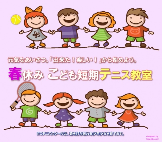 □ タイトル: 「もうすぐ春休み。新しくスポーツを始めるなら今!ITCテニススクールは恒例『こども短期テニス教室』の募集を開始します。楽しくて優しいコーチと一緒に「出来た!楽しい!」から始めよう!」