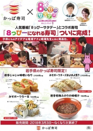 コロワイドグループのかっぱ寿司(カッパ・クリエイト(株) 本社:神奈川県横浜市 代表取締役 澄川浩太)は、2018年3月3日(土)より、岩手めんこいテレビ「8っぴーサタデー(毎週土曜日10:30~)」と共同開発したメニュー4品を、岩手県限定で販売いたします。