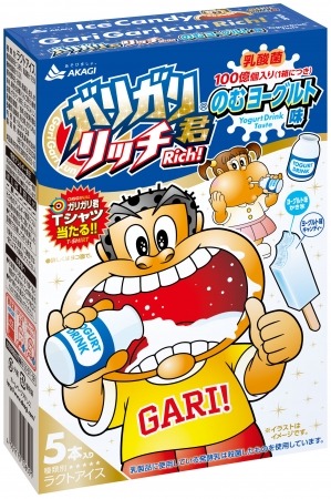 ガリガリ君リッチのむヨーグルト味は、ヨーグルト味のアイスキャンディーに、ガリガリ食感のヨーグルト味のかき氷を入れたアイスキャンディーです。乳製品や発酵乳を使用することで、ガリガリ君リッチシリーズならではの濃厚な味わいに仕上げています。乳酸菌100億個(1箱)入りで、今までには無かった健康力をサポートするガリガリ君です。