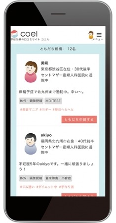コエル株式会社(所在:東京都北区、代表:伊藤ひろみ)は、妊活や不妊治療に取り組む人々に向けてオンライン上で仲間を見つけてつながることのできるコエル・コミュニティ(無料)をオープンしました。このサービスでは、自分と同じ病院に通う患者様や、「人工授精」や「体外受精」など自分と同様の治療を行う同年代の患者様を容易に見つけ、オンライン上で直接情報交換を行うことができます。