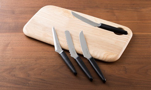 また同時発売するカッティングボードには、3種のナイフを支えるマグネットが内蔵されており、ナイフが滑り落ちないよう、安全にご利用いただける設計としました。また、ナイフが取り出しやすいように穴をあけたことで、フックにも掛けやすい、利便性の高さを実現しました。主張しすぎないシンプルなデザインが様々なシーンで彩りを添える商品です。