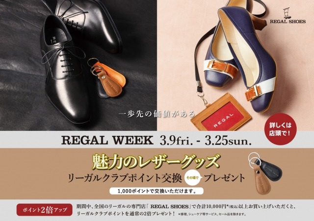 期間中、全国のリーガルの専門店「REGAL SHOES」では3月9日(金)から3月25日(日)の期間、靴を製造する過程で残った革に新しい命を吹き込んだ「魅力のレザーグッズ」をリーガルクラブポイント1,000ポイントと交換でプレゼントいたします。お買上げ時のポイントまたはお手持ちのポイントをその場でご利用いただけます。当日リーガルクラブにご入会(無料)いただいた方も対象です。