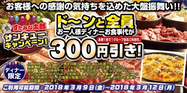 ■内容:クーポン提示でお一人様ディナー食事代300円OFF。本券1枚で1グループ全員ご利用いただけます。