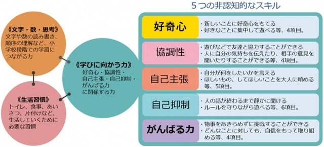ベネッセ教育総合研究所では、幼児期に育みたい生涯にわたって必要な力、小学校入学以降の学習や生活につながる力として、「好奇心」「協調性」「自己主張」「自己抑制」「がんばる力」の5つの非認知的なスキルを《学びに向かう力》として定義しました。ベネッセ教育総合研究所では、2012年より《学びに向かう力》の縦断研究(「幼児期から小学生の家庭教育調査」)に取り組み、幼児期の《学びに向かう力》が、「言葉」などの認知的なスキルの土台となることを明らかにしています。