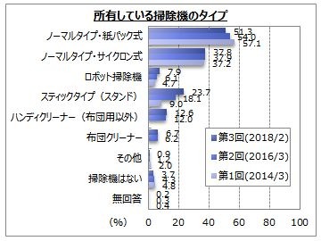 ロボット掃除機の所有者は7.9%です。「ノーマルタイプ・紙パック式」が51.3%、「ノーマルタイプ・サイクロン式」が37.8%、「スティックタイプ」が23.7%となっています。