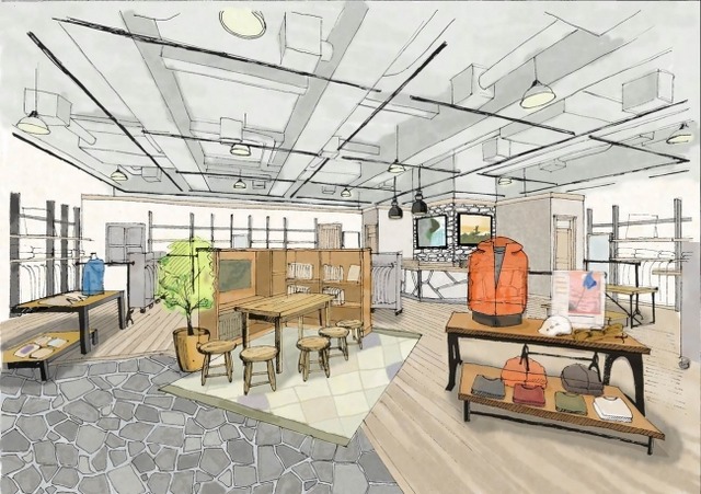 ストアの顔となるエントランスには美濃石を敷き、住居の玄関のように表現したほか、店内中央には、打ち合わせやワークショップなどにご利用いただけるコミュニティスペースを設け、アウトドアアクティビティや環境に関する様々な情報を発信します。