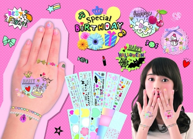 同商品は、専用のパフを使って、ボディーシールをお水で直接肌に転写することができる玩具です。ベースやデコレーション用のシールと半透明のフィルターシールを組み合わせてオリジナルのデザインのボディーシール作りも楽しめます。