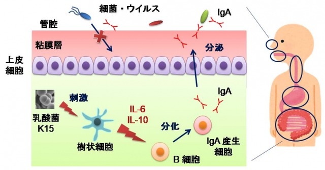 近年、ウイルス感染症が流行する中で、学校等における集団感染が問題となっている。腸管、口腔、鼻腔等の粘膜面に分泌される IgA と呼ばれる抗体は、病原菌やウイルスの侵入を防ぐために大きな役割を果たしており、今回、乳酸菌 K15 がヒト細胞からの IgA 産生を強く誘導することを見出した。さらに、IgA 産生増強効果には樹状細胞から産生される IL-6、IL-10(いずれも免疫反応における重要なサイトカイン)が関与していた。また、乳酸菌 K15 を12週間摂取することで、ヒトの唾液中の分泌型 IgA 濃度が有意に上昇することが示された。乳酸菌が関与する IgA 産生誘導メカニズムについてはこれまでマウスでは報告されていたが、ヒト細胞で今回初めて示された。今後、感染抵抗性の増強などへの乳酸菌 K15 の活用が期待される。