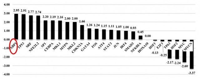 EWS/FLI1融合遺伝子の影響因子として、候補として挙がった延べ5600個のタンパク質リストから、小胞体ストレス応答経路を担う転写因子のXBP1が最も高い関連度を示した。なお、グラフ縦軸は数値が高いほど関連度が高いことを示す。