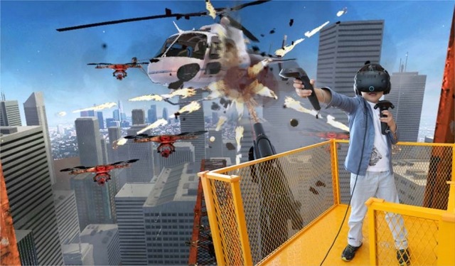 池袋の街並みに建つ超高層ビルの屋上にエレベーターであがり、攻撃を仕掛けてくるドローンやロボットを銃(コントローラー)で撃ち落としながら、不安定な細い鉄骨の上を渡りヘリコプターに乗って脱出するバーチャル体験が楽しめます。風や振動が映像と連動し、足がすくむ高さでの脱出体験で爽快感とスリルを味わうことができます。(500円/1回)