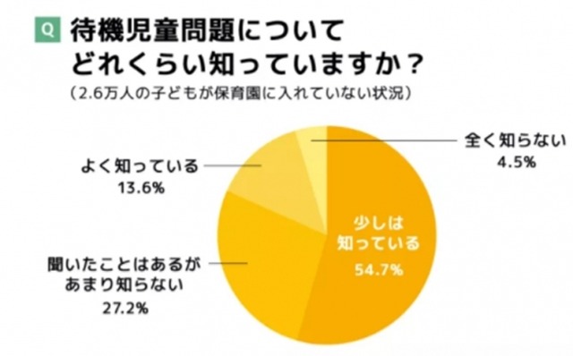 今も待機児童が増えている状況で、子どもたちを預かる保育士の不足も問題となっています。そこで高校生に「待機児童」についての認知度を伺いました。結果としては、95%ほど聞いたことがあり知っている回答でした。最も多かった回答は「少しは知っている」54.7%、次いで多かったのが「聞いたことはあるがあまり知らない」が27.2%という結果になりました。
