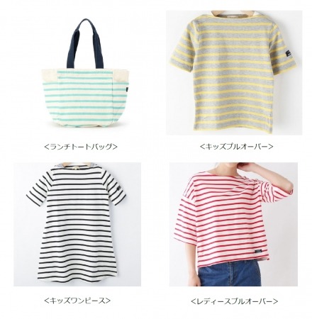 今回の商品は、ママと子どもがお揃いで楽しめる、ボーダーのランチトート、キッズプルオーバー、キッズワンピース、レディースプルオーバーの4アイテムです。「クレパス」をイメージした春にぴったりの美しい発色のボーダーデザインに仕上げました。
