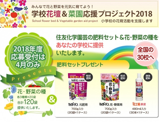 当社のホームページ「eグリーンコミュニケーション」内で、参加希望の学校を募り(募集期間:4月1日から4月30日)、抽選の上、計30校を対象に、当社の肥料セットに加えて、花と野菜の種を各3種類計120袋を一括で提供いたします。当選された学校花壇の花や野菜が育っていく様子や、子どもたち・先生方からのメッセージやコメントなどをWebサイト内で公開してまいります。より多くの小学校関係者の皆様にご参加いただきたく、是非、貴紙(誌)でのご紹介をお願い申し上げます。