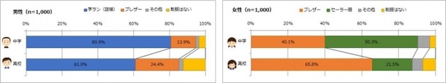 女性では、「中学」と「高校」で着用タイプが逆転。高校では「ブレザー(65.8%)」が「セーラー服(21.5%)」の3倍の着用率となった。