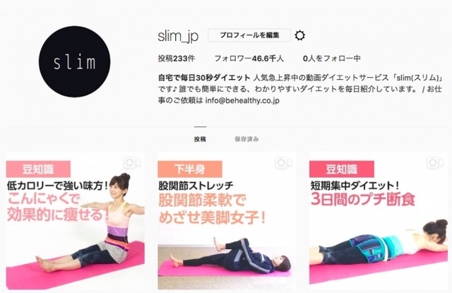 「slim」は、日本最大級のダイエット動画メディアです。Instagramのフォロワー数は4.5万人となっており、月間の再生数は250万回を突破しています。