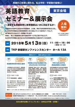 私立学校や学習塾といった教育機関に、各種コンテンツ・ソリューションを提供する株式会社エデュケーショナルネットワークでは、2018年5月13日(日)東京、5月23日(水)大阪にて「英語教育セミナー&展示会」を開催します。