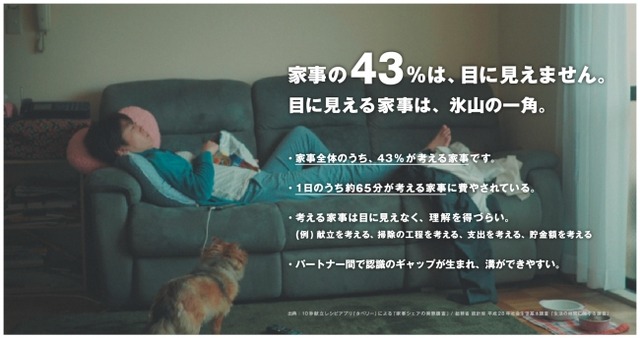 一見、女性がソファで横になりながら、お菓子を食べているだけのように見えますが、実は、女性は献立を考えていました。頭の中で行われる「考える家事」が存在することを視覚的に明らかにし、改めてパートナー間で認識されることを目指しています。