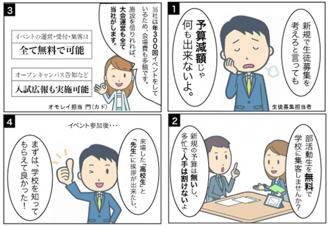 当社は年間300回ほどの部活動イベントを企画しており、集客や運営のノウハウがあります。施設をご提供頂く代わりに、施設でイベント開催をおこない、高校生に学校を知ってもらう機会を作ります。