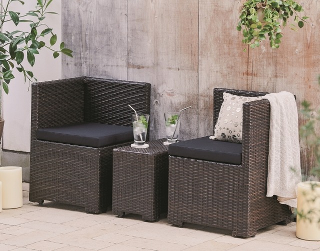 リゾートホテルにある高級ラタン家具のような仕上がりのソファ&テーブル。ラタンに見える素材は、水に強いポリプロピレン製で屋外に置いても安心です。クッション付きのソファは座り心地も快適で、2 脚並べれば、二人掛けソファのようにも使え、自宅にあわせて自由にレイアウトできます。ベランダや庭に置けるコンパクトサイズなのもうれしいポイントです。