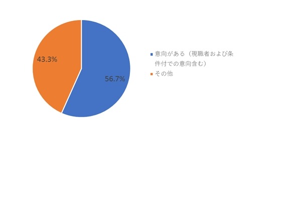 スマートシッターのベビーシッター登録者のうち保育士資格を保有し世田谷区に在住、または世田谷区で勤務可能な登録者を対象にアンケートを実施した結果、今後の保育園の就業意向について「意向ある」が57%となりました。調査対象者は勤務条件次第では保育園勤務が可能であり、勤務条件に加えて園の保育方針や子どもへの接し方などの保育の質を重視して、保育園勤務を検討することが分かりました。